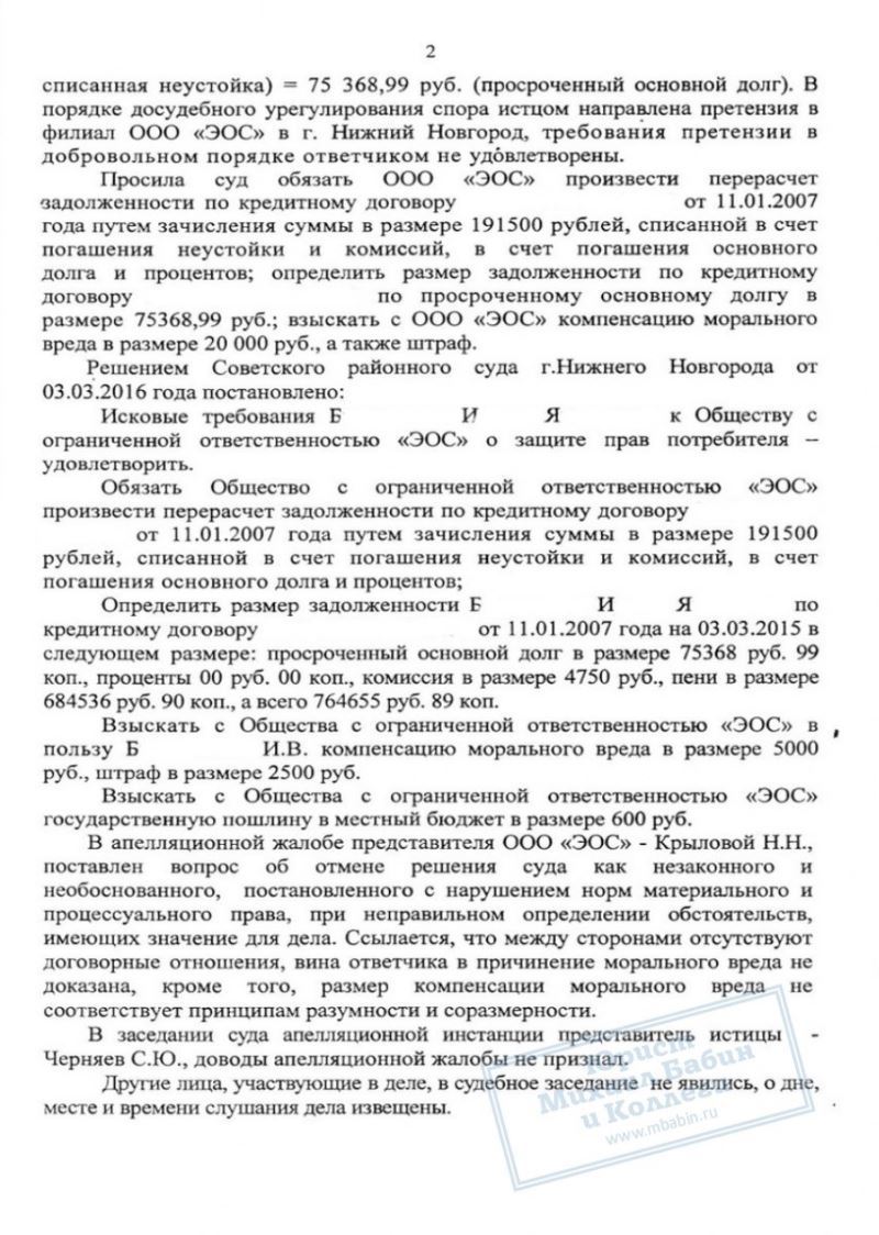 Кредитный юрист отстоял право клиентки на перерасчет долга. В результате её основной долг был уменьшен до 73 тыс.рублей, а коллекторское агентство "ЭОС" было вынуждено выплатить 7,5 тыс. руб. штрафа в пользу Б.И. за нарушение её прав.