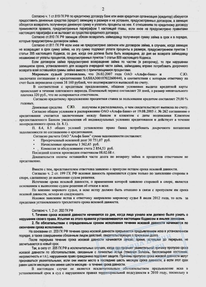 «Альфа Банк» подал в суд на С.Ю. на основании кредитного договора от 26.02.2007. Исковое требование состояло в выплате банку 34 968 рублей (сумма основного долга по кредитной карте + 29% годовых + комиссия за обслуживание счета + госпошлина).