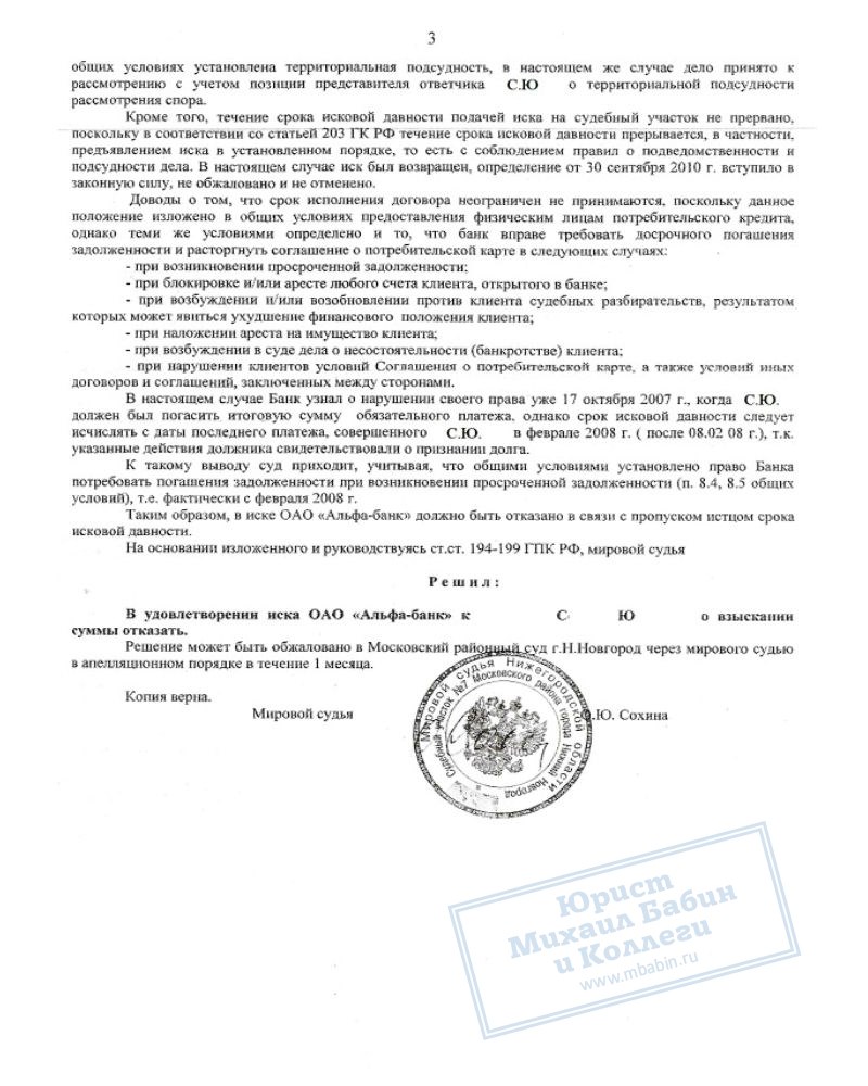 Юридическая помощь должнику оказывалась сотрудницей нашей компании. Из материалов дела следовало, что Гражданин С.Ю. прекратил надлежащим образом исполнять обязательства по договору кредитования с февраля 2008 года, однако иск банком был предъявлен только в 2012. Исковые требования банка были отклонены судом по причине пропуска Банком срока исковой давности, который установлен Гражданским Кодексом Российской Федерации и составляет 3 года. Спор о дате его исчисления был разрешён в пользу нашей сотрудницы