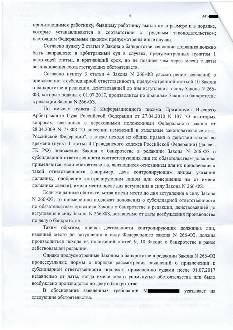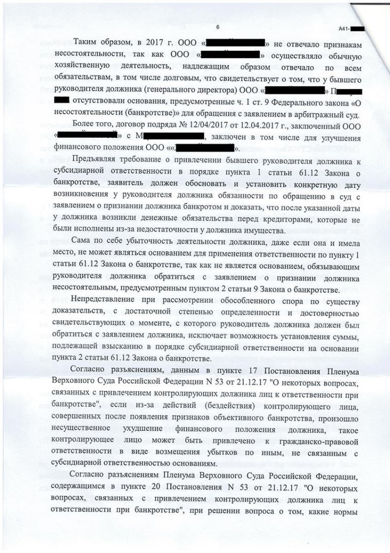 Адвокат изучил решение суда первой инстанции, выявил нарушения при его вынесении, подготовил и подал апелляционную жалобу на том основании, что на момент признании ООО «Х...» банкротом, у П., который являлся директором и участников должника – отсутствовала обязанность подачи заявления о банкротстве, в связи с чем привлечение его к субсидиарной ответственности необоснованно.