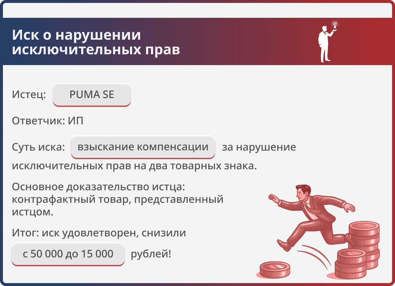 Защитить ИП в споре с немецкой компании PUMA SE от значительных финансовых претензий по иску о нарушении интеллектуальных прав на два товарных знака, минимизировать размер компенсации и судебных расходов, избежать длительного и затратного судебного разбирательства.