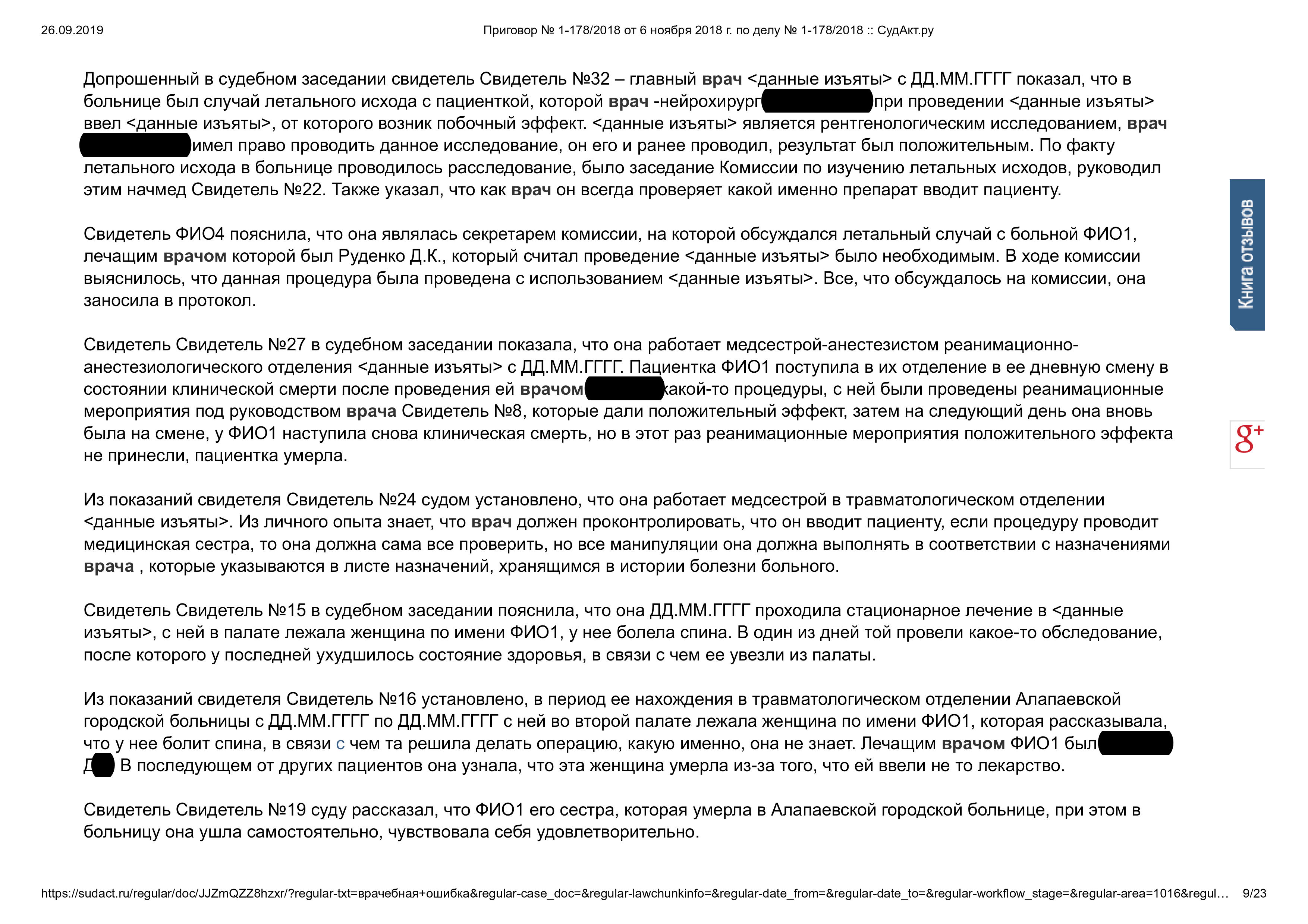 Суд признал врача виновным по ч. 2 ст. 109 УК РФ (причинение смерти по неосторожности). Назначено наказание: ограничение свободы и лишение права заниматься врачебной деятельностью на 1 год.
