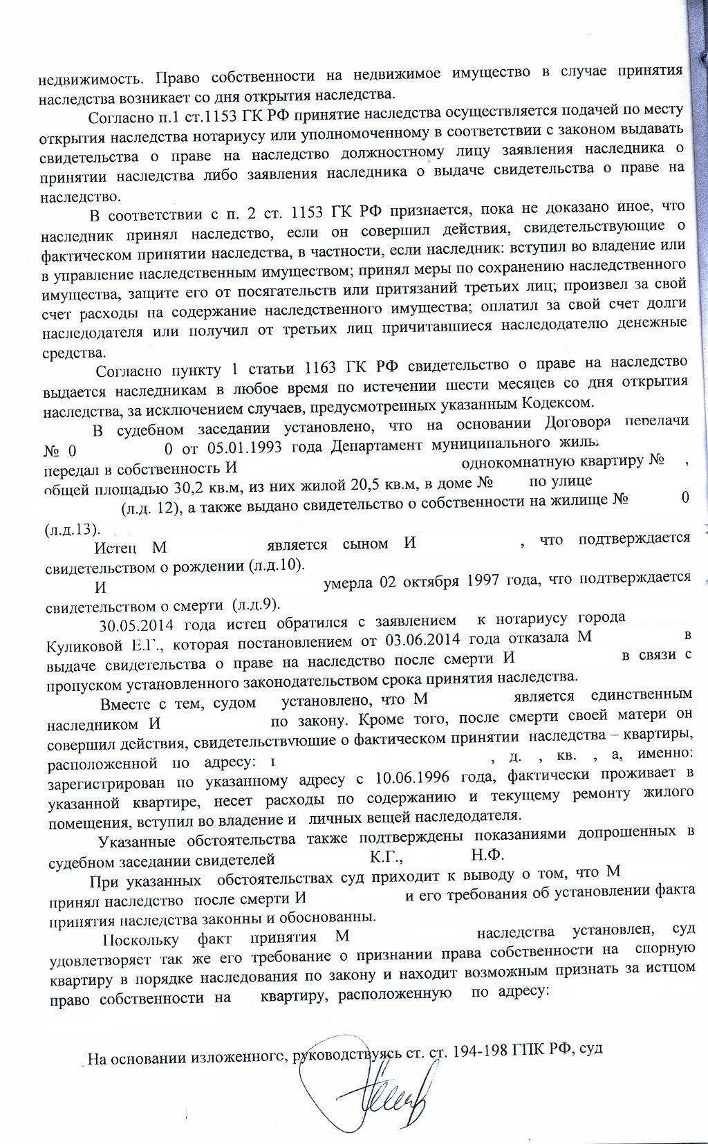 Решение об установлении факта принятия наследства