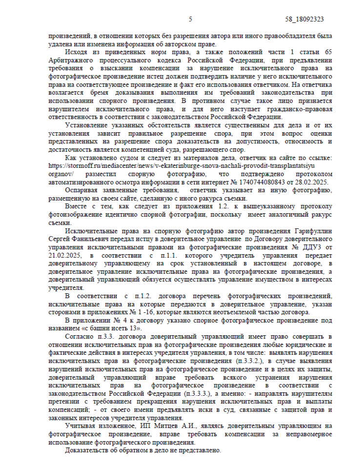 • Ответчик указывал, что договор доверительного управления был заключен в 2025 году, уже после того, как фото появилось на их сайте. По их логике, управляющий не имел права требовать компенсацию за прошлое нарушение.