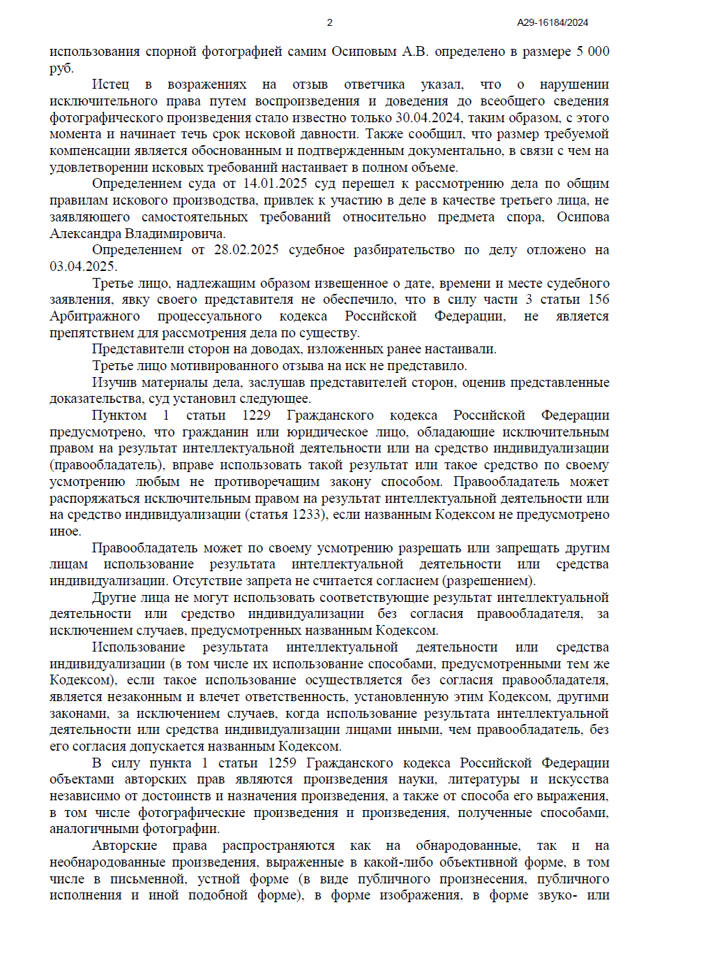 Арбитражный суд Республики Коми полностью удовлетворил наши требования. Суд признал, что использование фотографии без указания имени автора (Осипова А.В.) не может быть признано свободным цитированием, а срок исковой давности не пропущен.