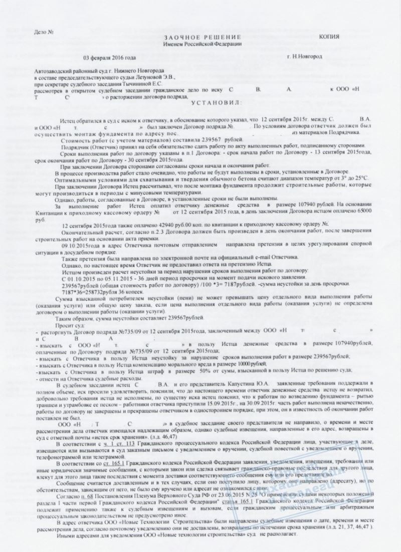 Наш клиент С. решил построить загородный дом и 12 сентября подписал договор со строительной компанией «Н» на заливку фундамента. Срок был установлен до 30 сентября. С. выплатил задаток 108 000 рублей. Однако подрядчик не торопился: работы начались позже, к обещанной дате фундамент готов не был. Начались осенние дожди и похолодание — заливка бетона стала невозможной, и стройку пришлось отложить на неопределённый срок. С. обратился к нам. Мы посоветовали направить подрядчику письменную претензию с требованием расторгнуть договор и вернуть задаток. Компания «Н» на мировую не пошла. Тогда мы подготовили исковое заявление в суд и отстаивали интересы клиента в рамках Закона о защите прав потребителей.