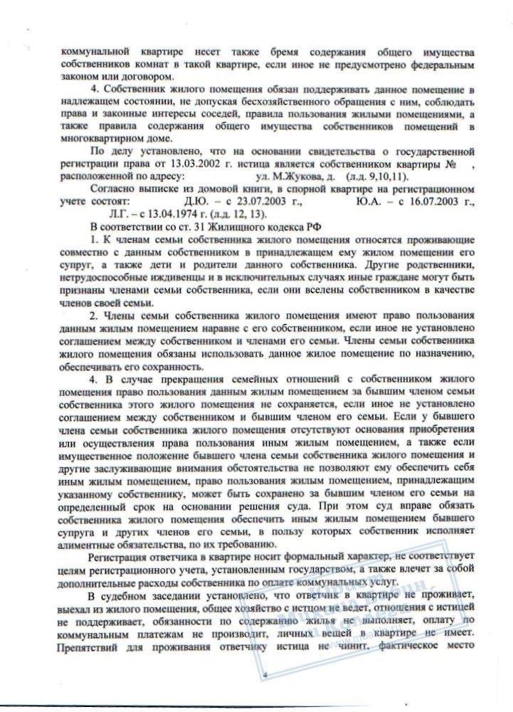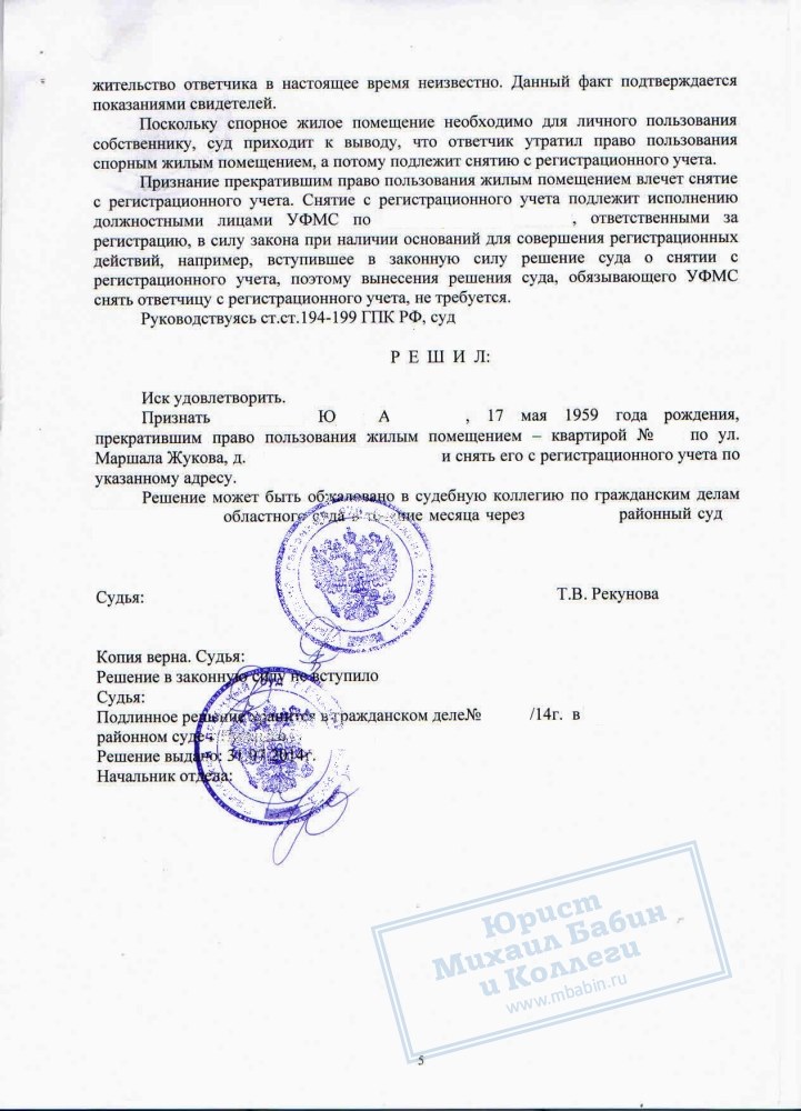 С помощью юриста нашей коллегии, нарушение закона было устранено, сын Б. признан прекратившим право пользования квартирой и выписан из нее.