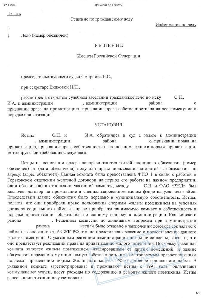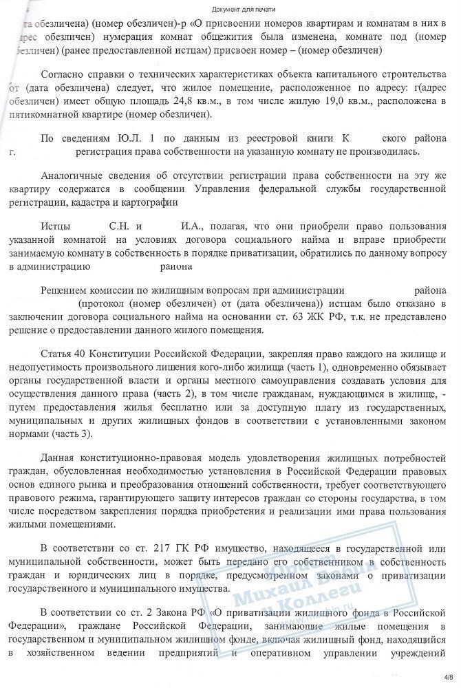 Гражданка К. попыталась оформить право на комнату в общежитии после смерти своего мужа, но ей было отказано. Только благодаря грамотным усилиям юриста за ней и ее сыном было признано право собственности на данное помещение.